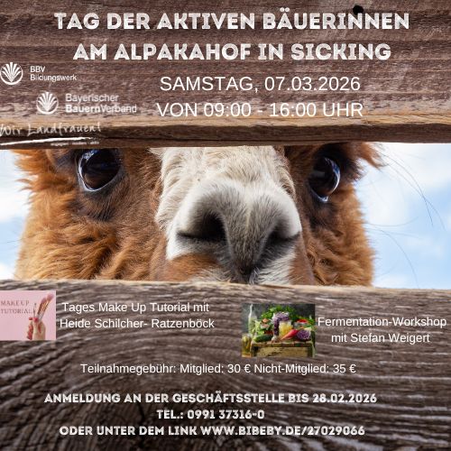 Am 07.03.2026 von 09:00 Uhr bis 16:00 Uhr findet der Tag der aktiven Bäuerinnen auf dem Alpakahof in Sicking statt.