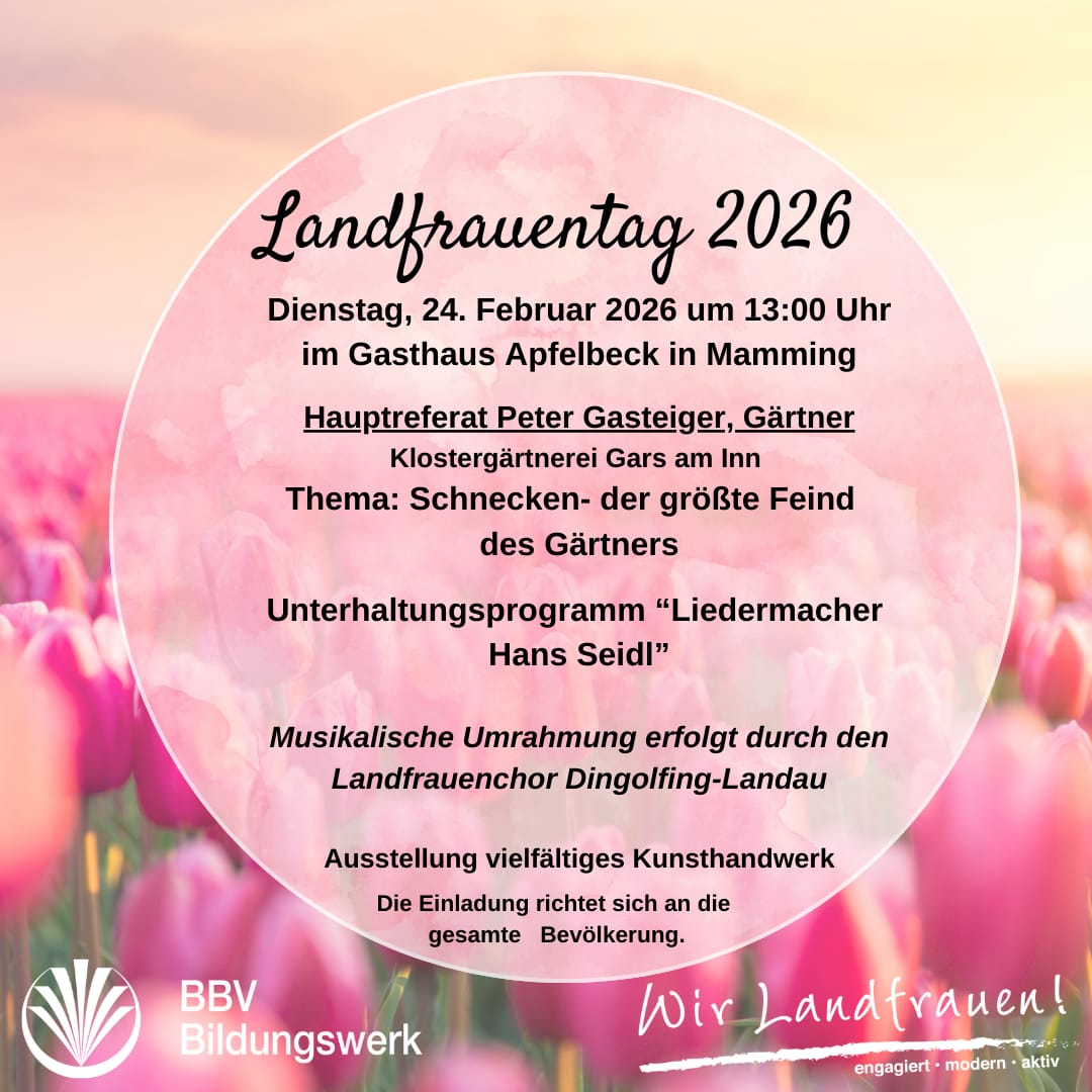 Am Dienstag, den 24. Februar 2026, findet um 13:00 Uhr der alljährliche Landfrauentag der BBV-Landfrauengruppe Dingolfing-Landau im Gasthaus Apfelbeck in Mamming statt.