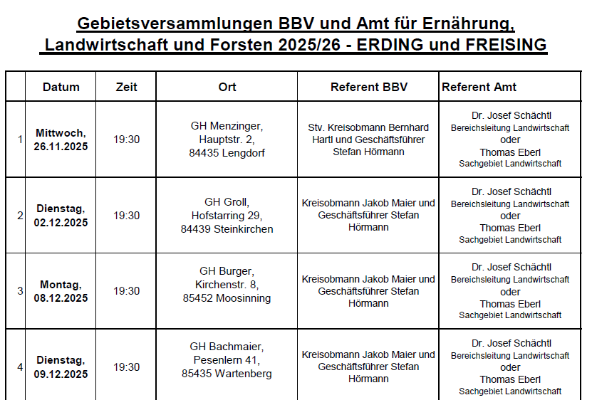 21.11.2025 | Der BBV Erding-Freising und das Amt für Ernährung, Landwirtschaft und Forsten Ebersberg-Erding veranstalten im Winter 202/26 wieder 8 Gebietsversammlungen