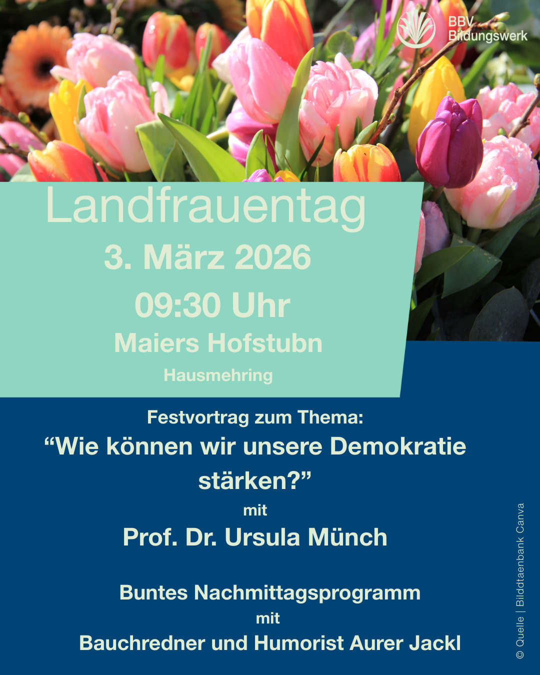 Der Landfrauentag des BBV-Kreisverbandes Freising findet am 03.03.2026 im Gasthaus Maiers Hofstubn in Hausmehring statt. Der Festvortrag zum Thema: "Wie können wir unsere Demokratie stärken?" mit Prof.Dr. Ursula Münch und ein buntes Nachmittagsprogramm mit Bauchredner und Humorist Aurer Jackl mit gemütlichen Ratsch erwartet Sie an dieses Festtag.