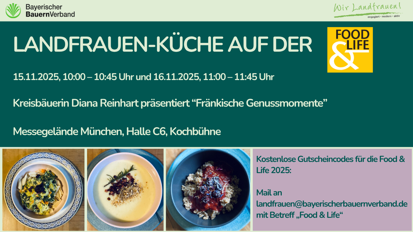 Unter landfrauen@bayerischerbauernverband.de (Betreff: „Food & Life“) können Sie kostenlose Gutschein-Codes - solange der Vorrat reicht - anfordern.