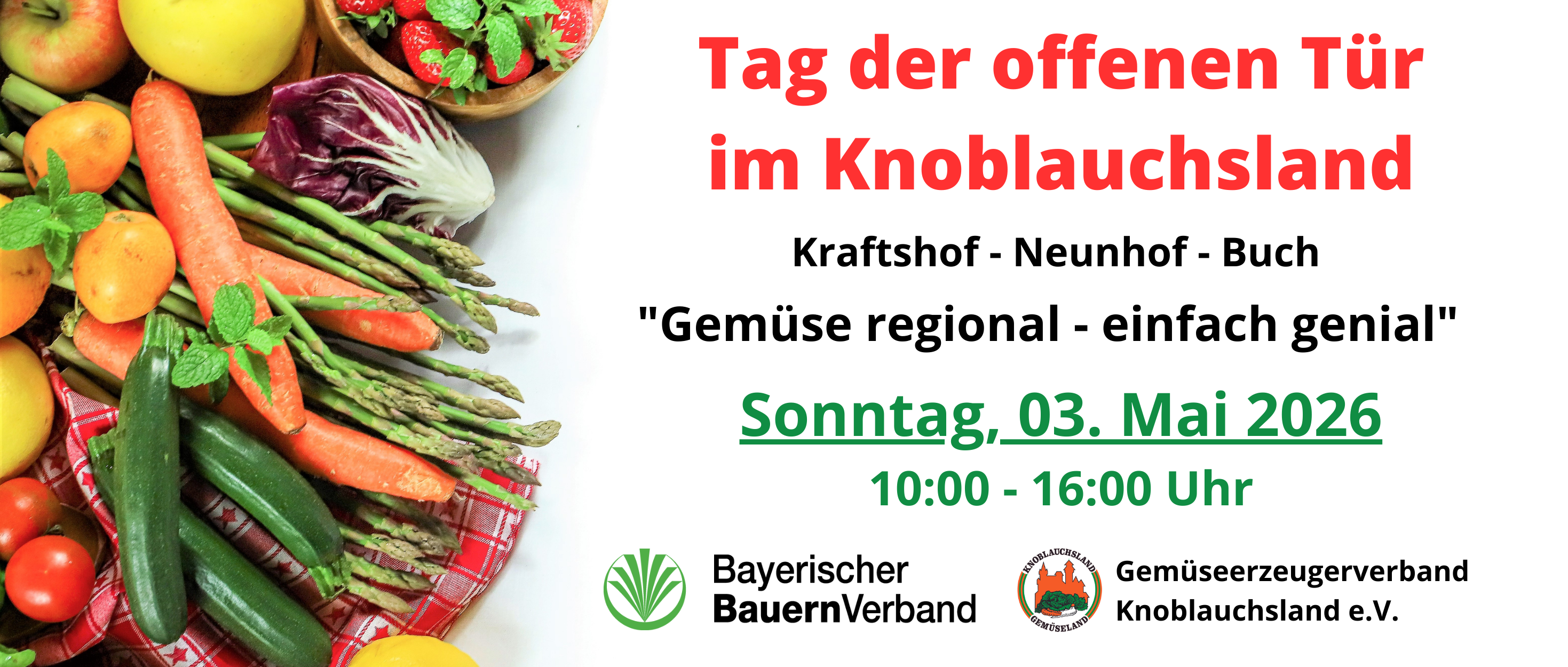 Der Tag der offenen Tür im Knoblauchsland ist eine traditionelle Veranstaltung im Nürnberger Knoblauchsland, einem der größten zusammenhängenden Gemüseanbaugebiete Deutschlands. Am Sonntag, den 3. Mai, öffnen in Kraftshof, Neunhof und Buch zahlreiche Gemüsebau- und Landwirtschaftsbetriebe von 10 bis 16 Uhr ihre Tore und geben spannende Einblicke in den modernen Gemüsebau – vom Anbau über die Pflege bis hin zur Ernte.