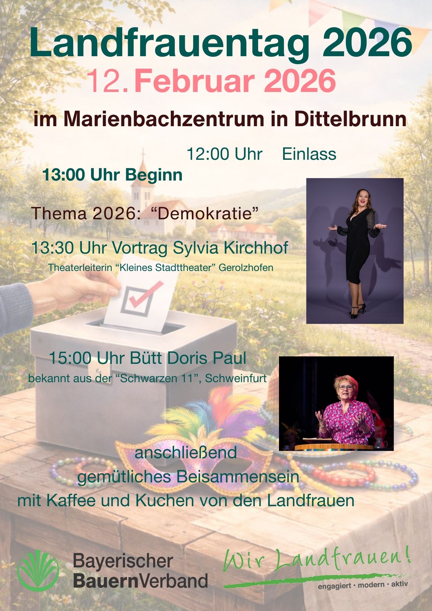 An Altweiberfasching findet im Marienbachzentrum in Dittelbrunn der Landfrauentag 2026 statt. Er steht unter dem Motto "Demokratie"