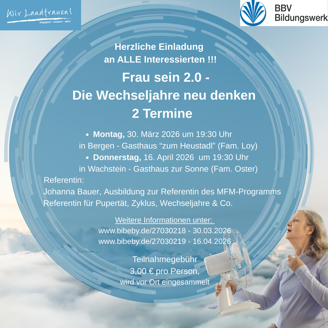 Mit anschaulichen Materialien, Texten, Bildern und Musik werden im Vortrag die körperlichen und seelischen Veränderungen in den Jahren des Wechsels verständlich dargestellt.