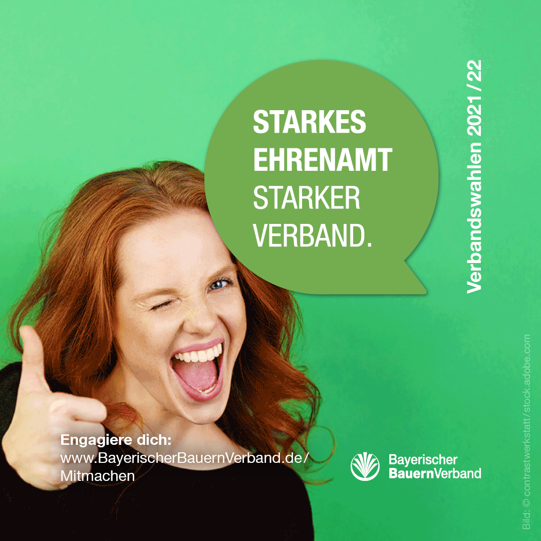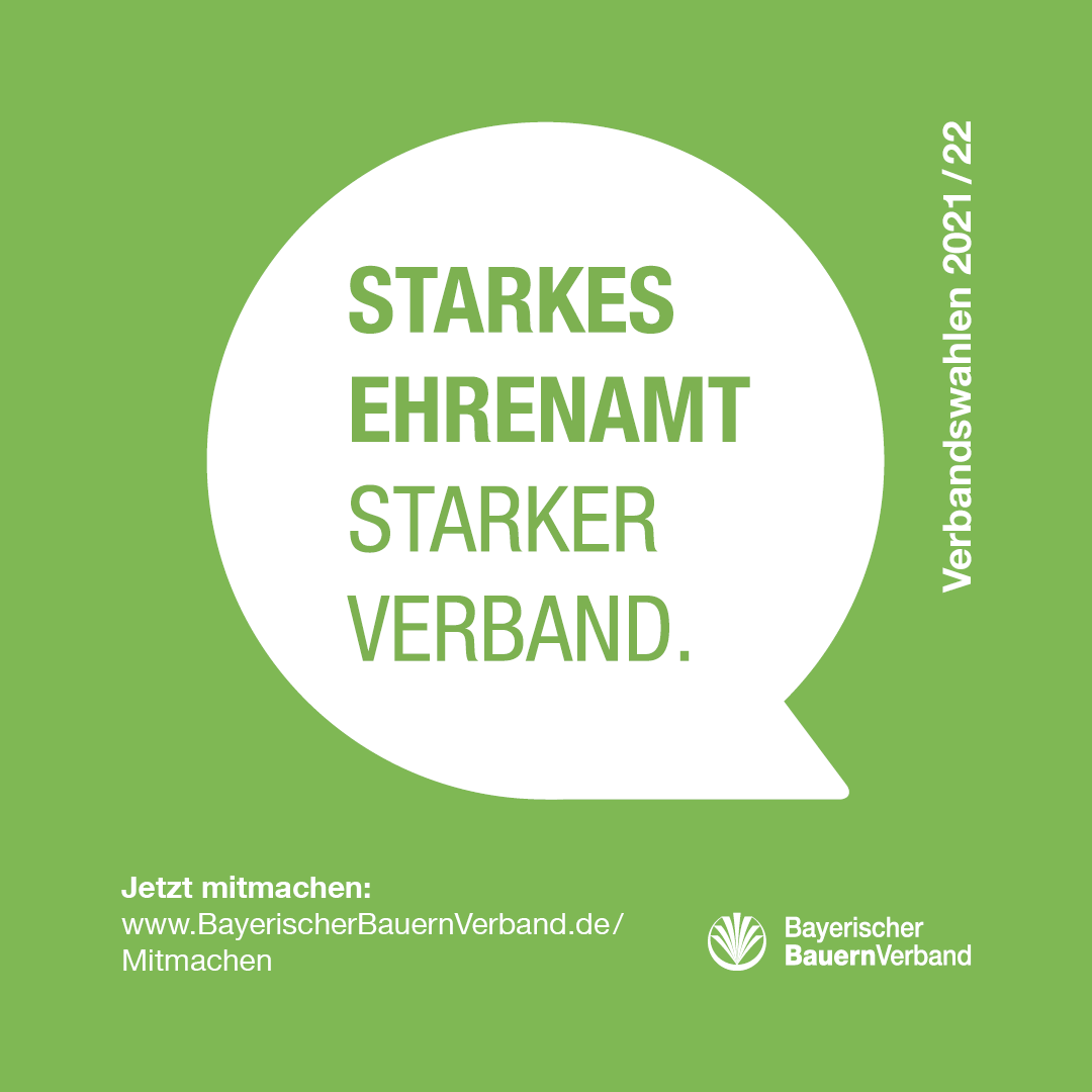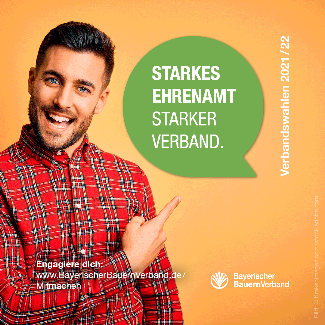 Haben Sie schon einmal mit dem Gedanken gespielt, zu kandidieren und Ihren Verband mitzugestalten? Ein starker Bauernverband braucht starke Persönlichkeiten. So entsteht ein starkes Netzwerk, das dem ganzen Berufsstand Rückenwind verschafft. Bringen Sie sich aktiv ein! Der Bayerische Bauernverband ist ein Mitmachverband! Jeder kann die Zukunft mitgestalten, kann Verantwortung übernehmen. Berufliches Engagement endet nicht am Hoftor. Nur mit einem starken Ehrenamt kann es uns gelingen, gegenüber Gesellschaft und Politik Gehör zu finden und unsere Interessen durchzusetzen. Doch es geht um viel mehr: Bäuerinnen und Bauern im Ehrenamt geben der Land- und Forstwirtschaft vor Ort ein sympathisches Gesicht.