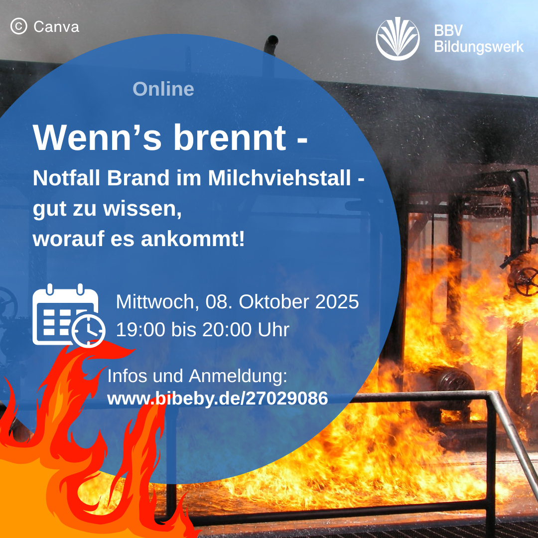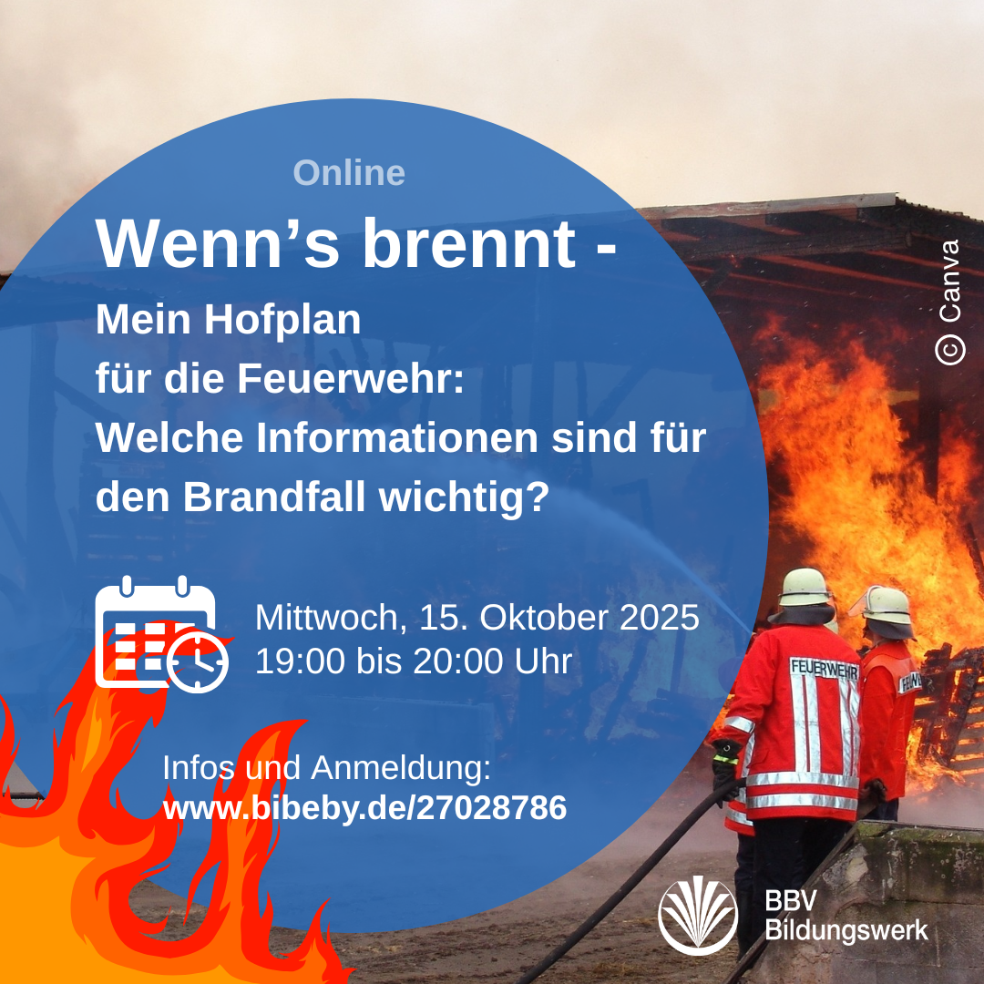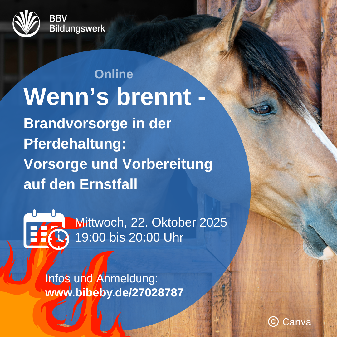 11.11.2025 | Einen Stallbrand möchte niemand erleben. Doch nicht immer sind Stallbrände schicksalhafte Ereignisse: Manche Ursachen sind vermeidbar – unsere Info-Veranstaltungen zeigen, welche das sind, und wie Sie vorsorgen. Letzter Termin der Reihe: Mi, 19.11.25, 10 Uhr!