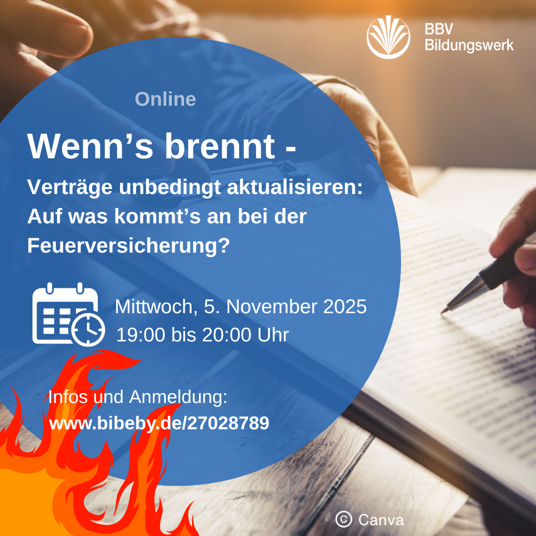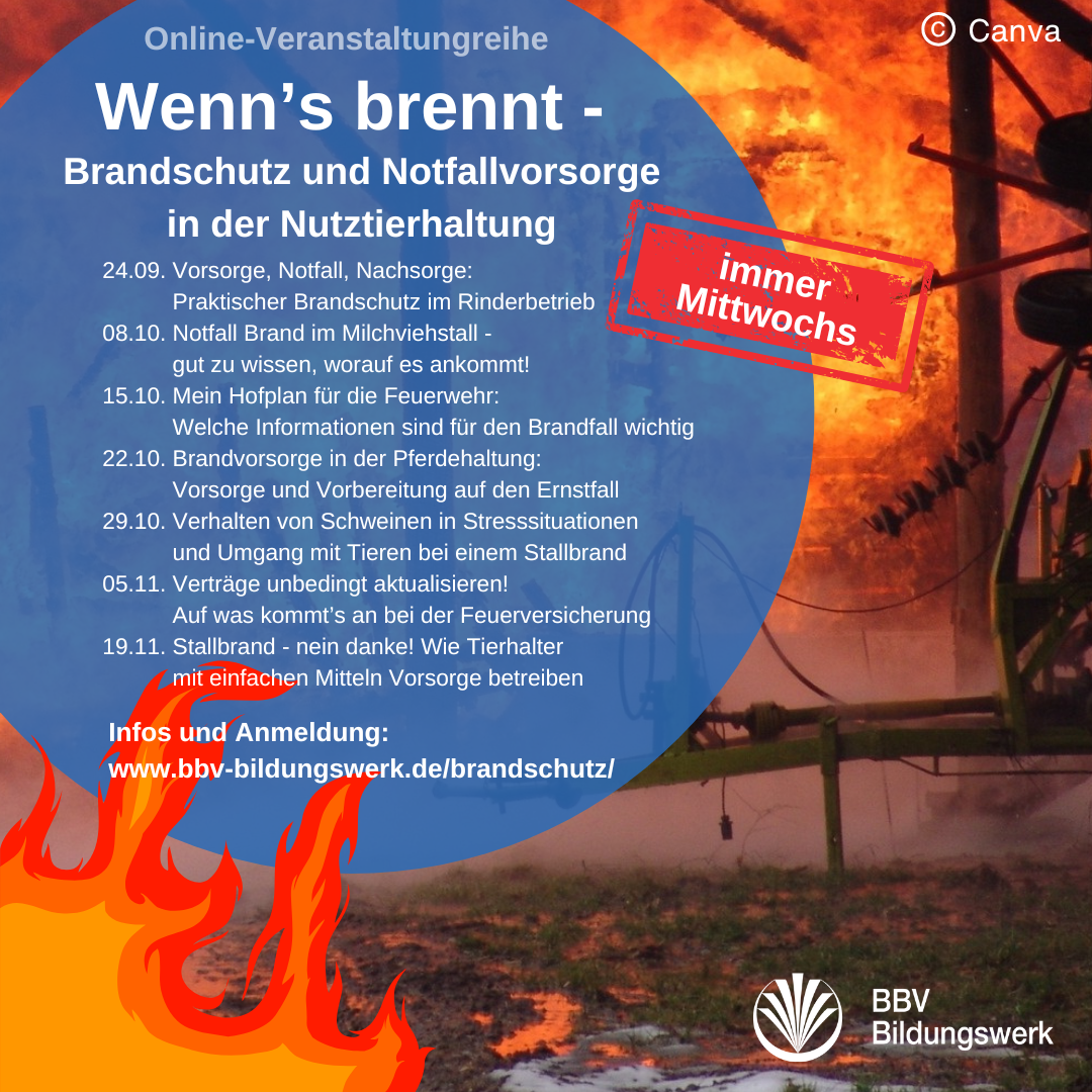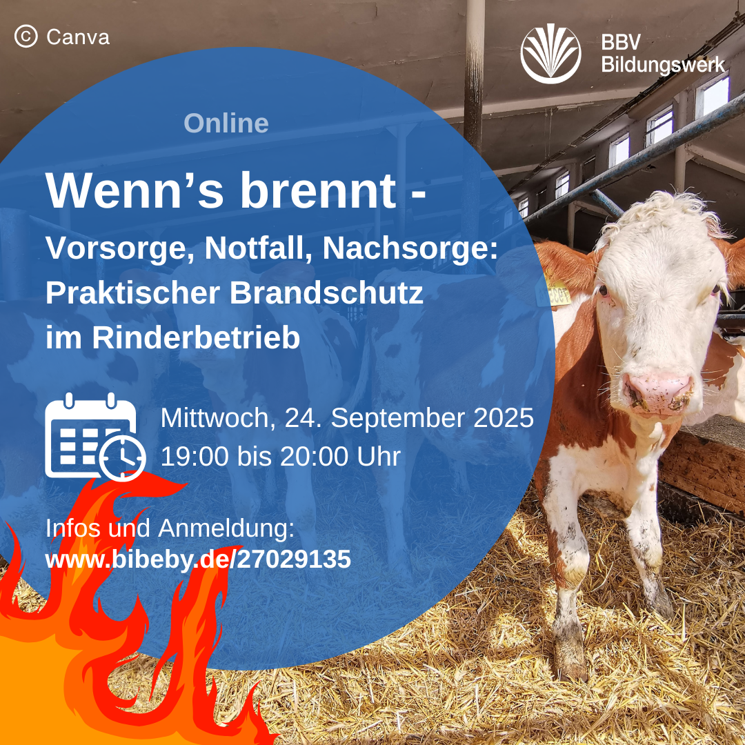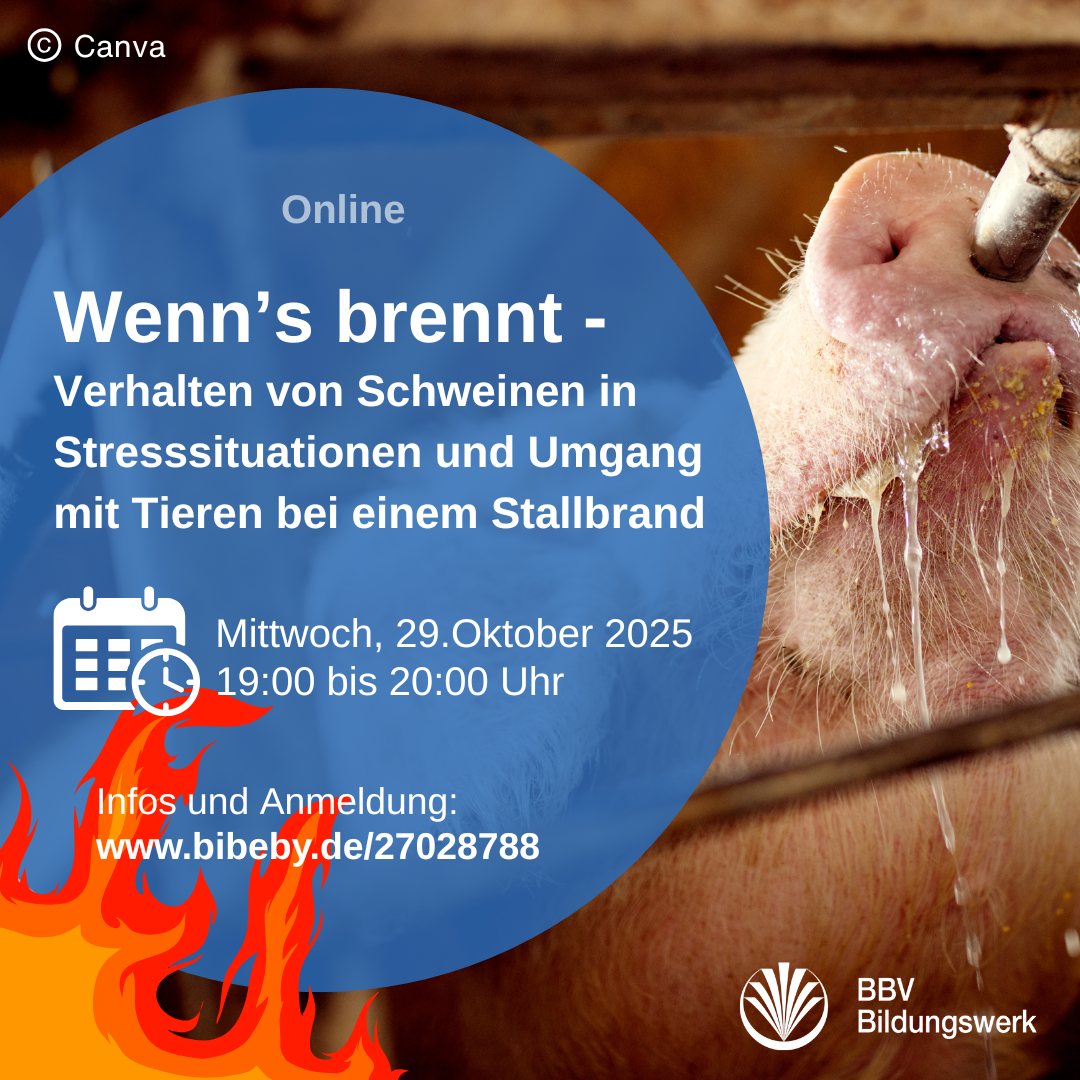 11.11.2025 | Einen Stallbrand möchte niemand erleben. Doch nicht immer sind Stallbrände schicksalhafte Ereignisse: Manche Ursachen sind vermeidbar – unsere Info-Veranstaltungen zeigen, welche das sind, und wie Sie vorsorgen. Letzter Termin der Reihe: Mi, 19.11.25, 10 Uhr!