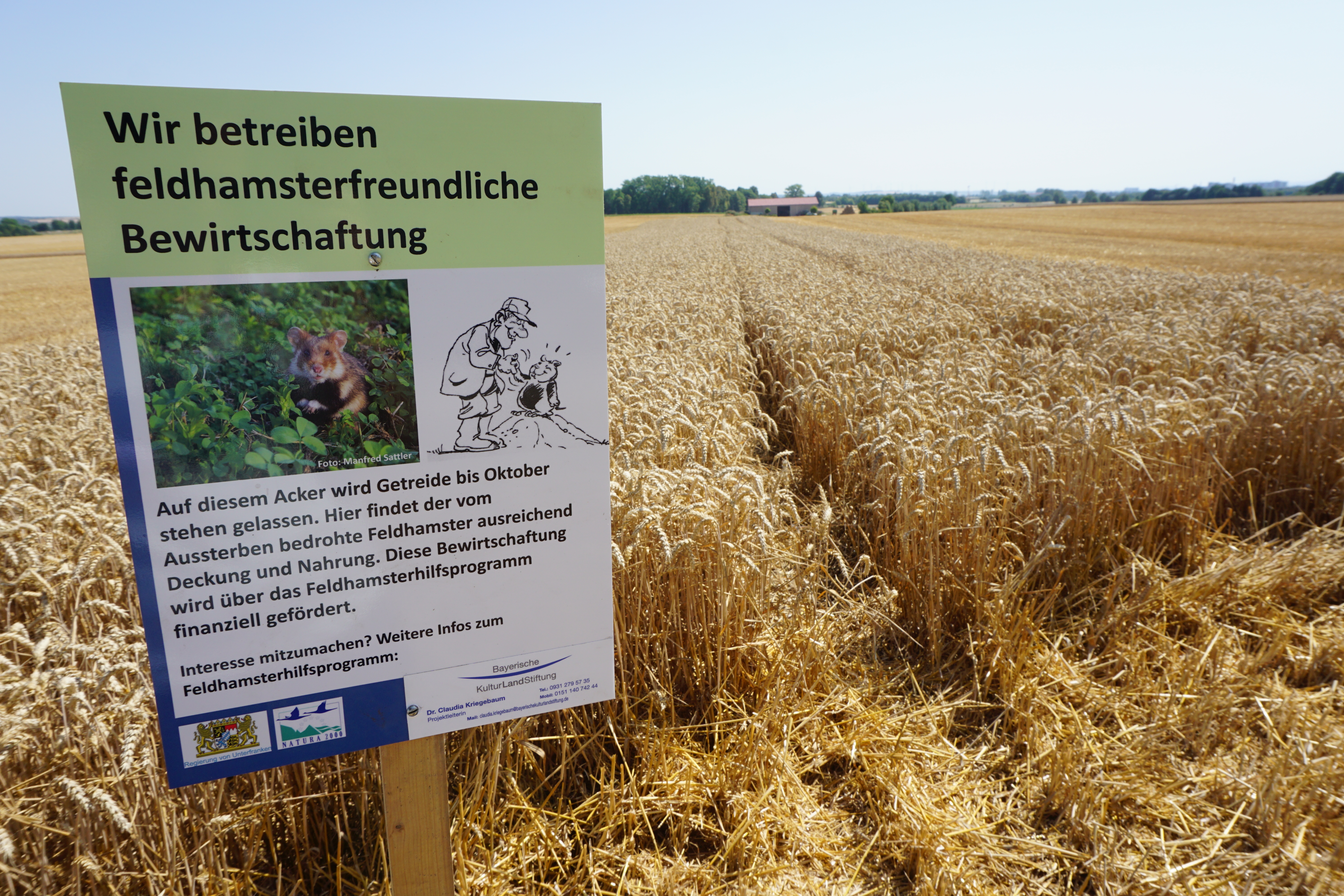 Im Landkreis Schweinfurt finden solche Hamsterschutz-Maßnahmen auf einer Gesamtfläche von 42 Hektar statt. Unterstützung erhalten die Landwirte dabei von der Bayerischen Kulturlandstiftung. Die Landwirte schaffen zumeist in Getreidebeständen fünf bis zehn Meter breite Streifen. Hier können die Tiere vor der Winterruhe Bauten und Vorräte anlegen. „In diesem Jahr war die freiwillige Bereitschaft der Landwirte zum Schutz der Feldhamster so groß wie nie“, sagt Claudia Kriegebaum von der Bayerischen Kulturlandstiftung.