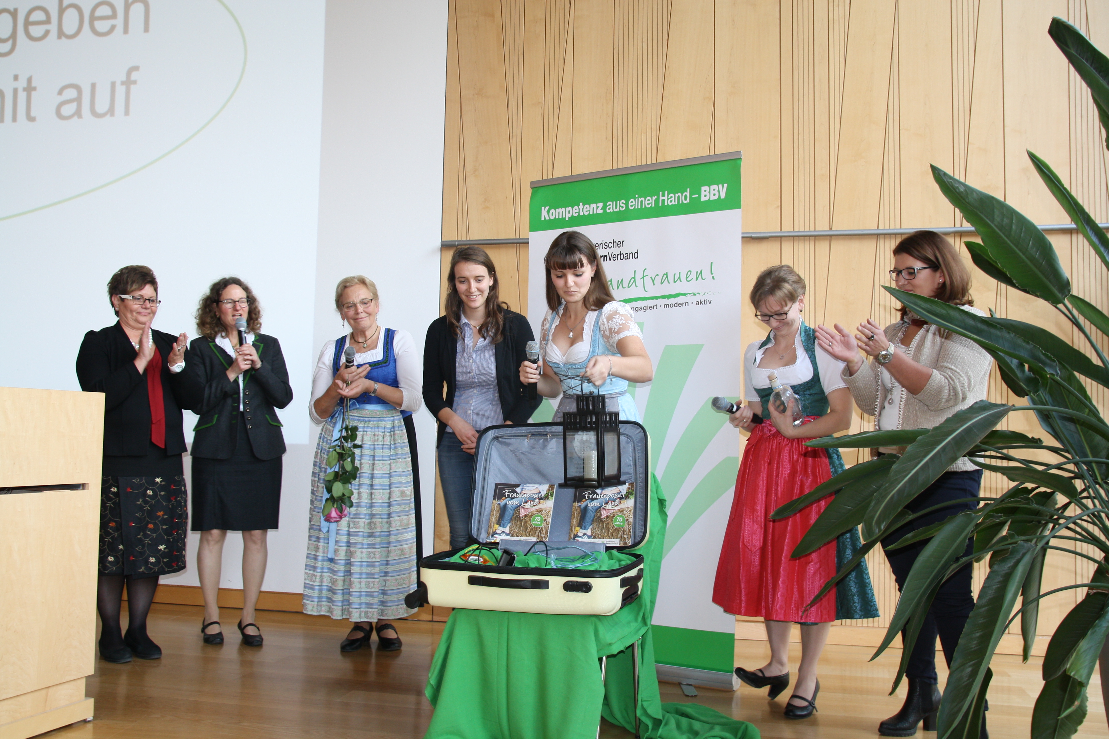 Neben Landesbäuerin Anneliese Göller äußerten sich fünf weitere Frauen zu der Frage, wie sie sich die Landfrauenarbeit der Zukunft vorstellen: Ehrenlandesbäuerin Annemarie Biechl, die dlv Jungunternehmern des Jahres Elisabeth Meir, Katja Ölberger als Vertreterin des Netzwerks „Junge Landfrauen“, die Vorsitzende der Bayerischen Jungbauernschaft Tina Stünzendörfer und die ehemalige Grundkurssprecherin Susanne Kilian. Sie alle brachten ein Geschenk mit, das die Landfrauen die kommenden 20 Jahre auf ihrem Weg unterstützen und begleiten soll. Landesbäuerin Göller steuerte einen Kompass bei. Er weise den Weg und helfe, das gesetzte Ziel zu erreichen. Ehrenlandesbäuerin Annemarie Biechl legte den Landfrauen zwei Rosen in den Koffer der Zukunft: eine Knospe für das Bewahren von Werten und Traditionen und eine aufgeblühte Rose für Veränderung. „Wir übergeben eine Laterne, um den Weg auszuleuchten und Möglichkeiten aufzutun“, sagte die BJB-Vorsitzende Stünzendörfer. Elisabeth Meir übergab den Landfrauen ein Fläschchen Mut. „Mit den Jahren werden Sie diesen brauchen, um Veränderungen zu wagen und auch Ihre Interessen zu vertreten. Es erfordert Courage, zu seinen Vorstellungen und Traditionen zu stehen“, sagte die erfolgreiche Jungunternehmerin. Katja Ölberger übergab ein blaues Ballenband. „Früher hat dieser ´blaue Strick´ den ganzen Hof zusammengehalten. Man konnte sich einen Betrieb ohne diese Ballenbänder gar nicht vorstellen. Die Landfrauen müssen wie durch so einen ´blauen Strick´ zusammenhalten und vernetzt sein“, sagte sie. Die ehemalige Grundkurssprecherin Susanne Kilian legte einen Schlüssel in den Koffer. „Er soll dafür stehen, um weiterhin Türen zu öffnen für die neuen Herausforderungen der Zukunft. Andererseits soll er symbolisieren, dass es wichtig ist, Traditionen und Werte sicher zu bewahren.“