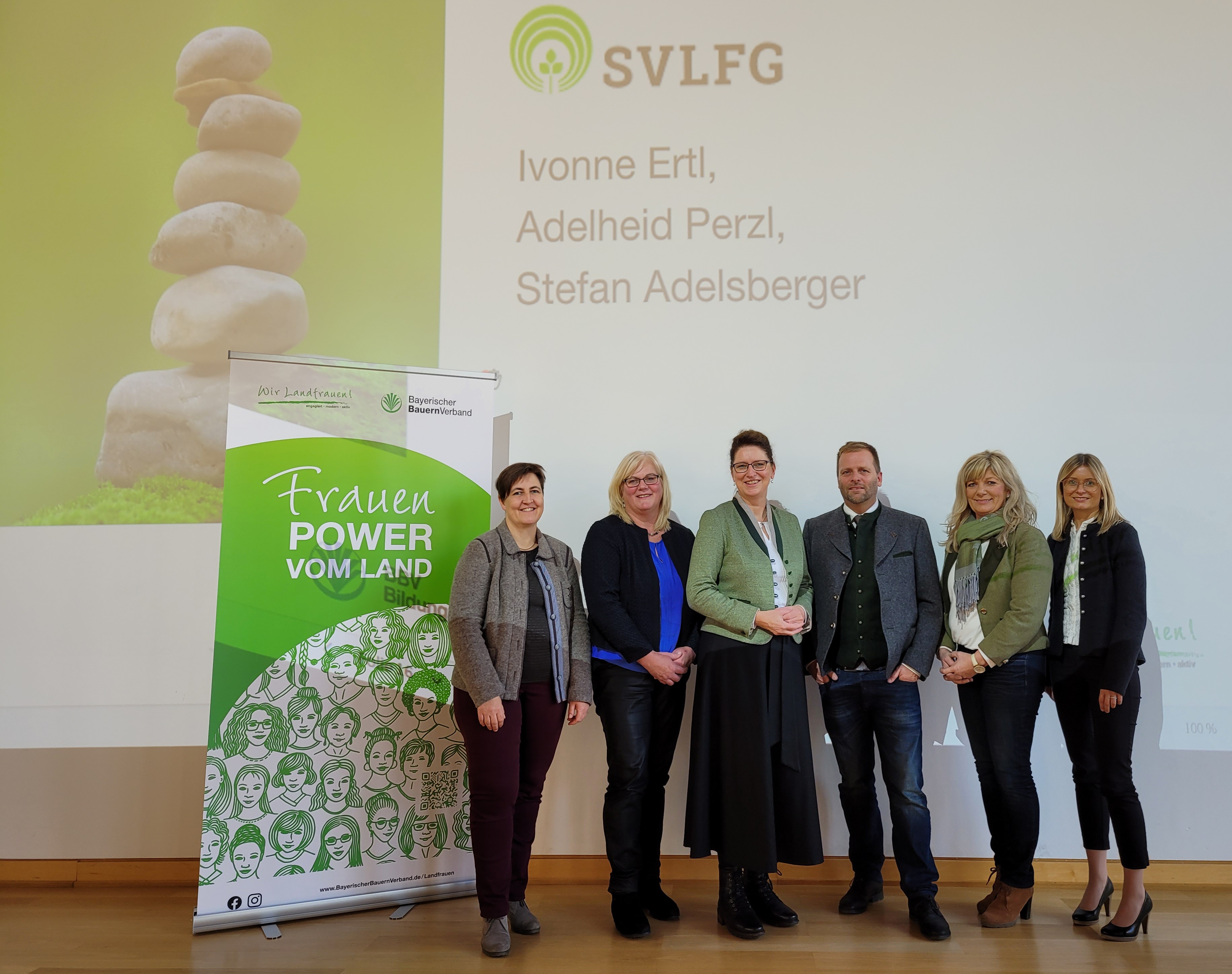 (v. r.) Ivonne Ertl, Adelheid Perzl und Stefan Adelsberger von der SVLFG, Landesbäuerin Christine Singer, stellv. Landesbäuerin Christine Reitelshöfer und zweite stellv. Landesbäuerin Christiane Ade.