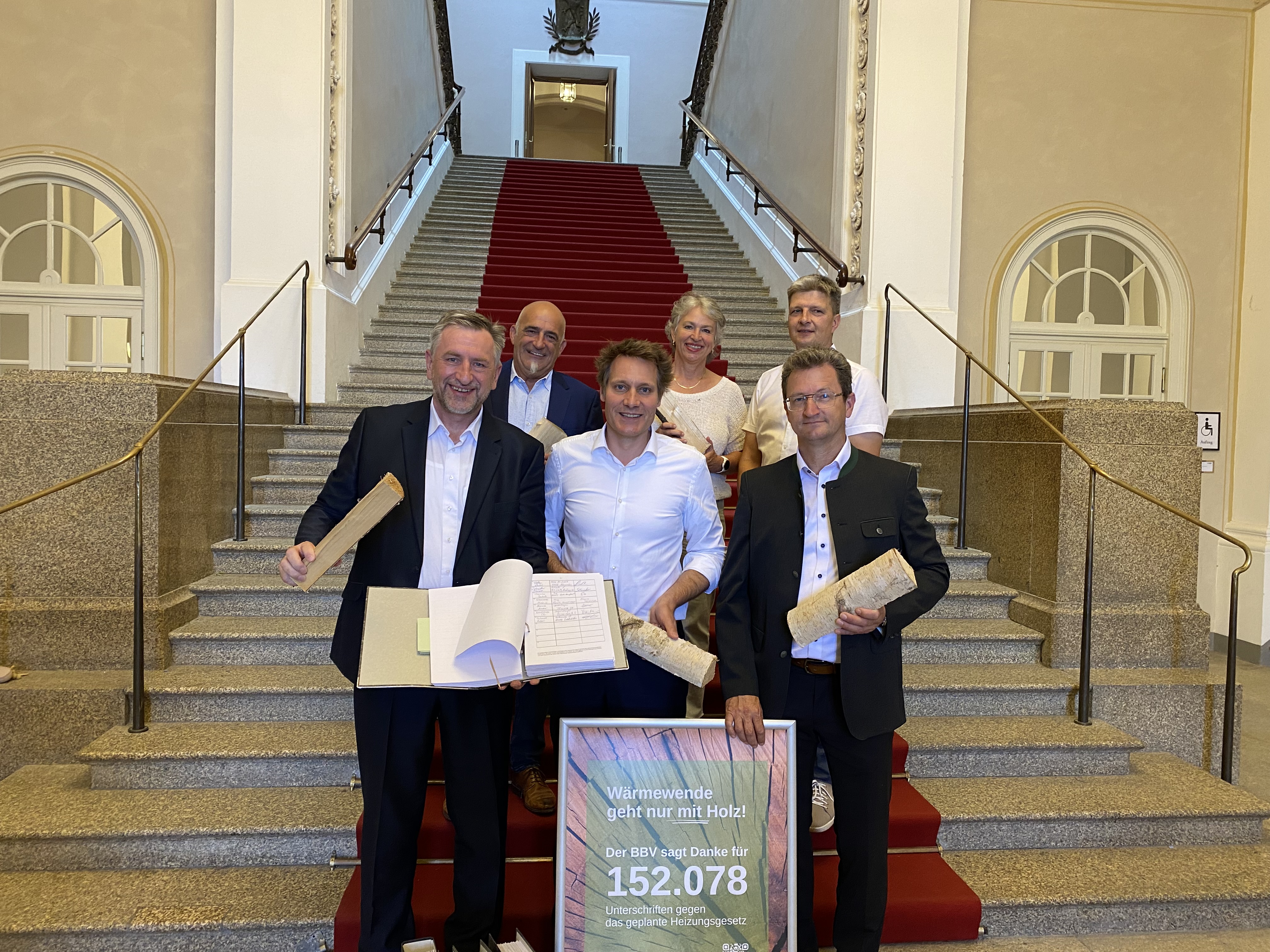 Der Bayerische Bauernverband hatte mehr als 150.000 Unterschriften von Menschen gesammelt, die auf eine Änderung des Kabinettsentwurfs drängten und sich für das Heizen mit Holz aussprachen. Als symbolisches Zeichen und als Dank für ihren guten Einsatz in Berlin übergaben BBV-Präsident Günther Felßner, Siegfried Jäger, BBV-Waldpräsident und Bezirksvorsitzender Niederbayern, und Ralf Huber, Bezirksvorsitzender Oberbayern, die Unterschriften an Ludwig Hartmann, Fraktionsvorsitzender der Grünen im Bayerischen Landtag, Hans Urban, forst- und jagdpolitischer Sprecher, und Gisela Sengl, Sprecherin für Ernährung und Landwirtschaft.