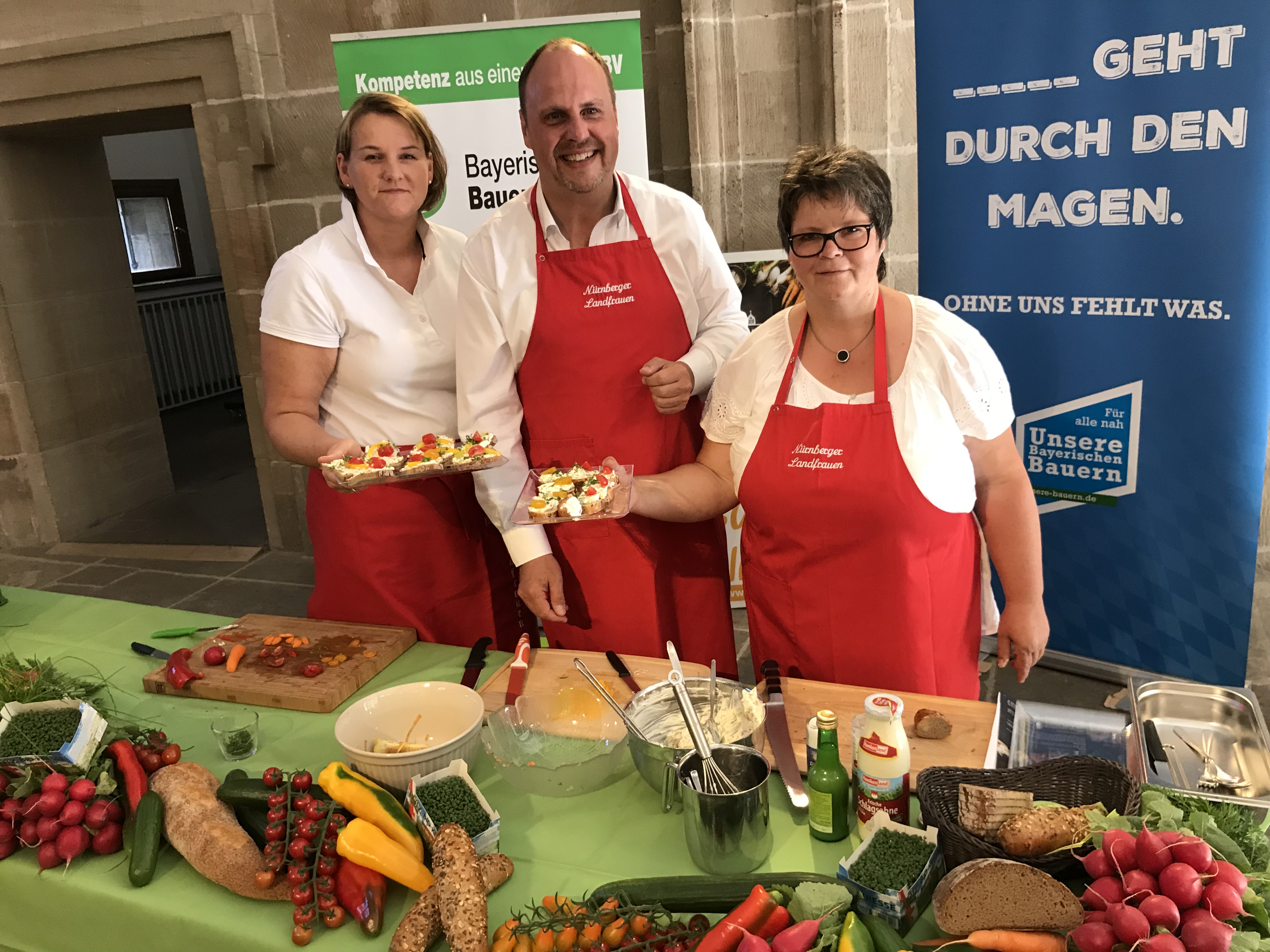 Die Bauernmarktmeile, die vom Bayerischen Bauernverband (BBV) in Zusammenarbeit mit dem Bayerischen Staatsministerium für Ernährung, Landwirtschaft und Forsten, der Stadt Nürnberg und dem Bayerischen Rundfunk / BR Heimat veranstaltet wird, steht unter dem Motto ‚Land erleben und genießen in Franken‘. „Für jeden Geschmack, ob Fleisch, Fisch, Gemüse oder Obst, ist am kommenden Sonntag etwas Leckeres dabei“, so die Nürnberger Kreisbäuerin Doris Greul-Leuzmann. Zusammen mit Bürgermeister Vogel bereitetet sie heute das offizielle Bauernmarktmeilen-Gericht 2019 zu: "Fränkische Streich(el)-Einheiten aufs Bauernbrot".