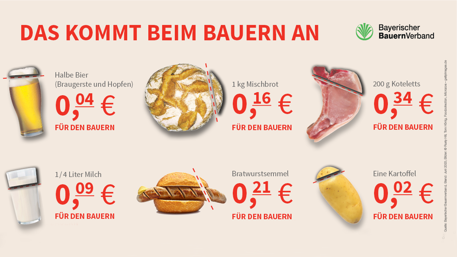 23.07.2020 | Eine Halbe Bier, eine Bratwurstsemmel, ein Kotelett: Vom Geld, das Verbraucher an der Ladentheke ausgeben, kommt oft nur ein Bruchteil beim Erzeuger an. Das zeigt diese aktuelle Grafik des Bayerischen Bauernverbandes.
