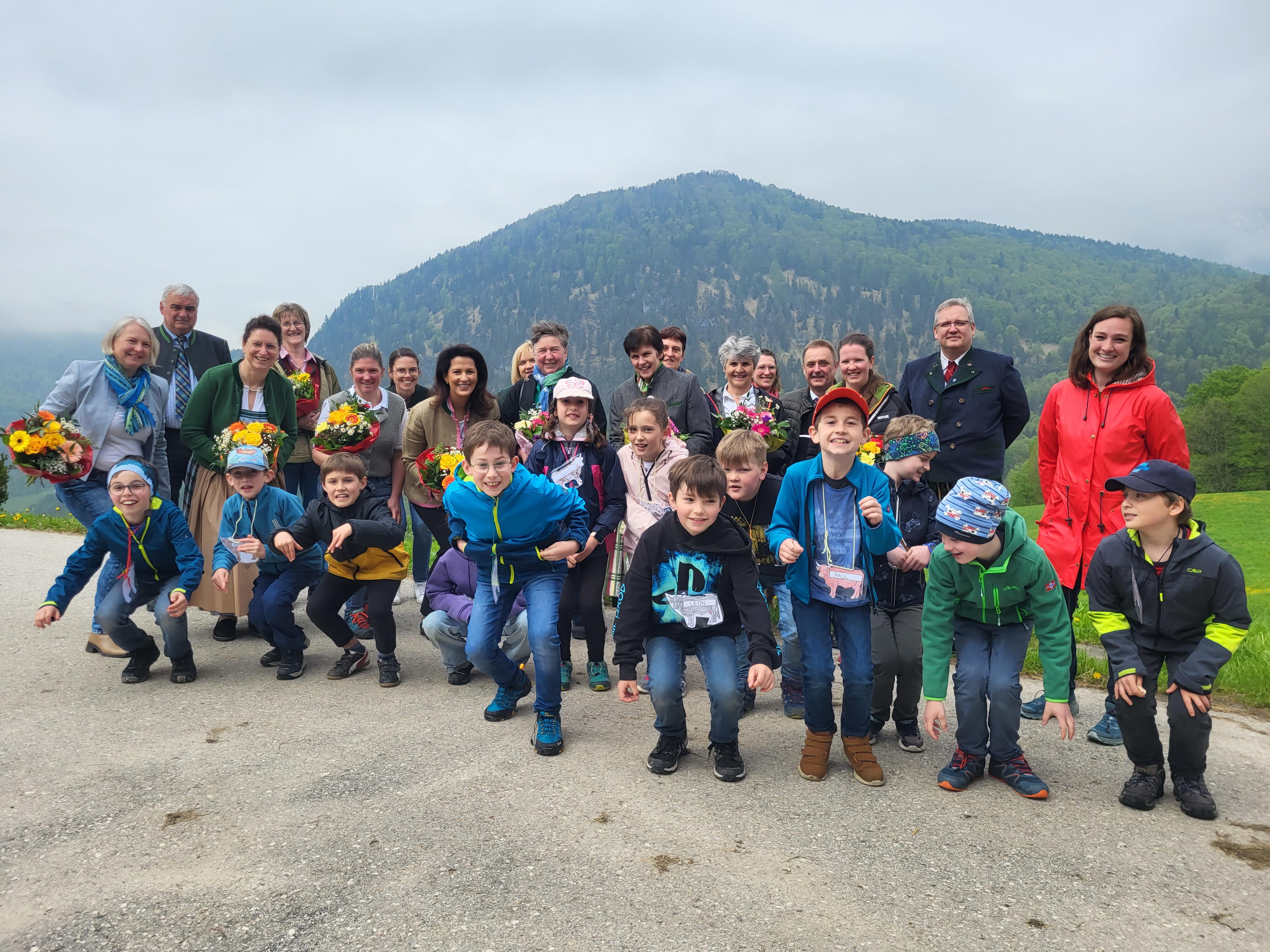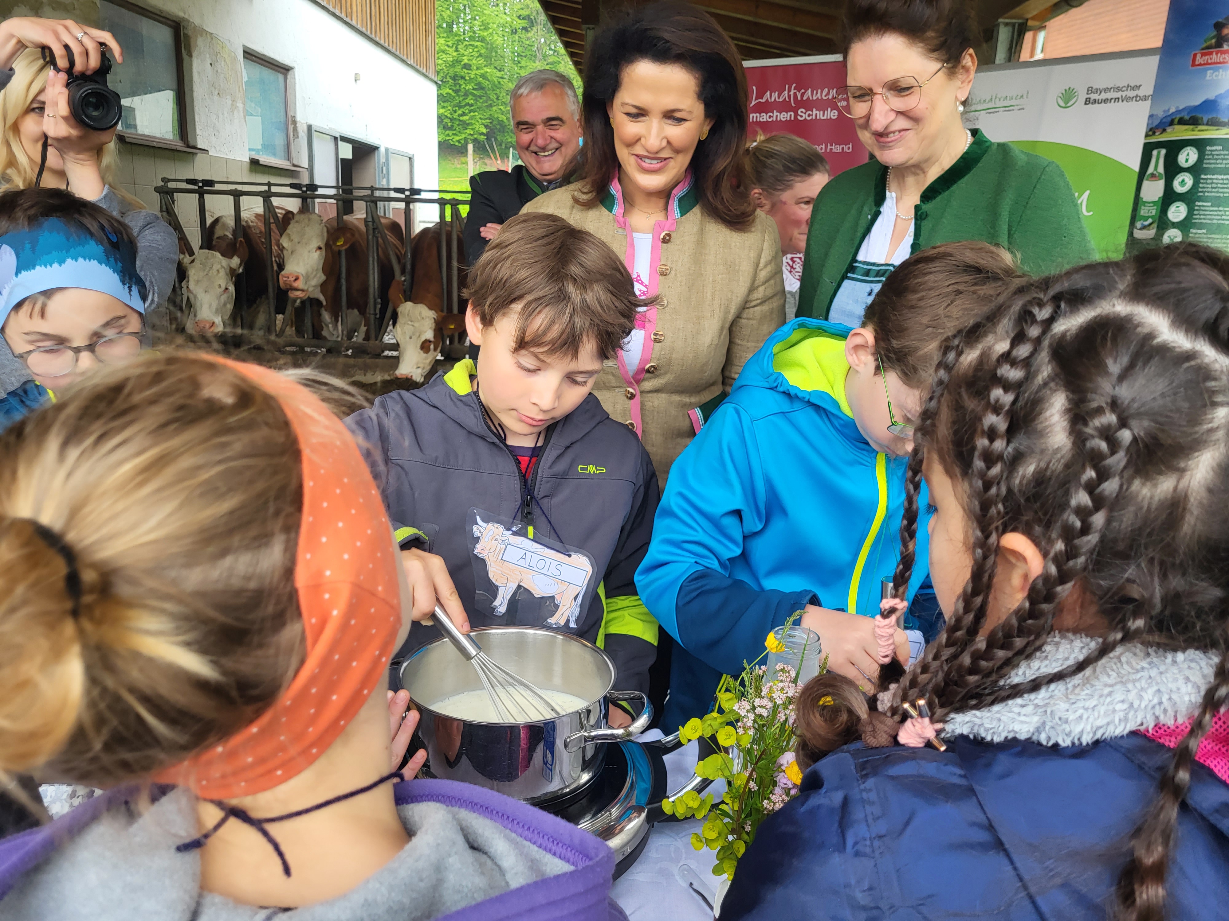Zusammen mit Landesbäuerin Christine Singer und Schirmherrin Staatsministerin Michaela Kaniber erforschten die Kinder auf dem Hof, wie aus Gras Milch wird. Eine Woche zuvor hatten sich die Kinder in der Schule mit dem Lebensmittel Milch befasst und zusammen mit Ernährungsfachfrau Maria Schauer kleine Gerichte zubereitet. Den Landfrauen ist ein praxisbezogener Ansatz wichtig: „Die Kinder erleben den Bauernhof, sie lernen Lebensmittel kennen, haben sie in der Hand, schneiden und kochen selbst, fühlen, riechen und schmecken sie und können so Wertschätzung für unsere heimischen Produkte und eine gesunde Ernährung aufbauen“, erklärt die Landesbäuerin.