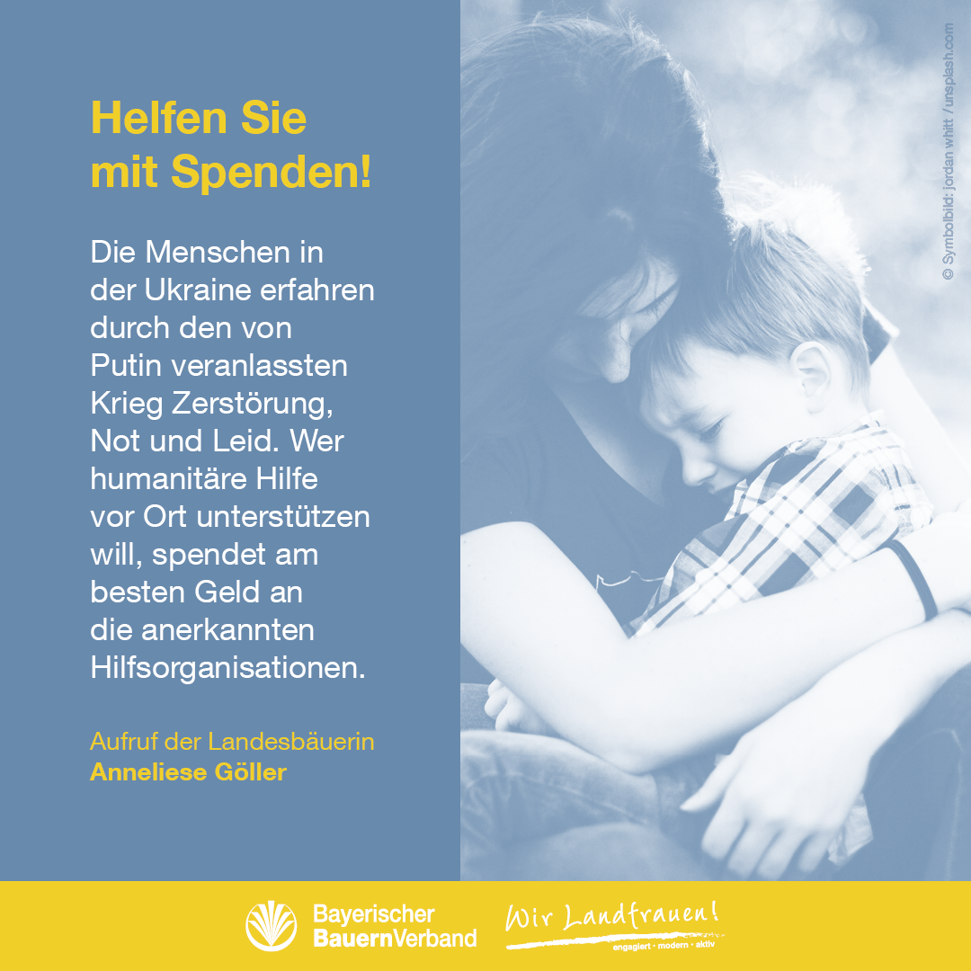 „Im Moment bedarf es für die betroffene ukrainische Bevölkerung neben Beistand auch humanitärer Hilfe. Bäuerinnen und Bauern, die helfen möchten, sollten sich an anerkannte Hilfsorganisationen wenden“, erklären Bauernpräsident Walter Heidl und Landesbäuerin Anneliese Göller anlässlich der dramatischen Bilder der letzten Tage.Trotz der schwierigen Lage vor Ort leisten Hilfsorganisationen humanitäre Hilfe in der Ukraine. „Jeder der aktuell helfen will, sollte sich am besten an die regionalen Stellen der anerkannten, großen Hilfsorganisationen oder deren Adressen für Geldspenden wenden.“