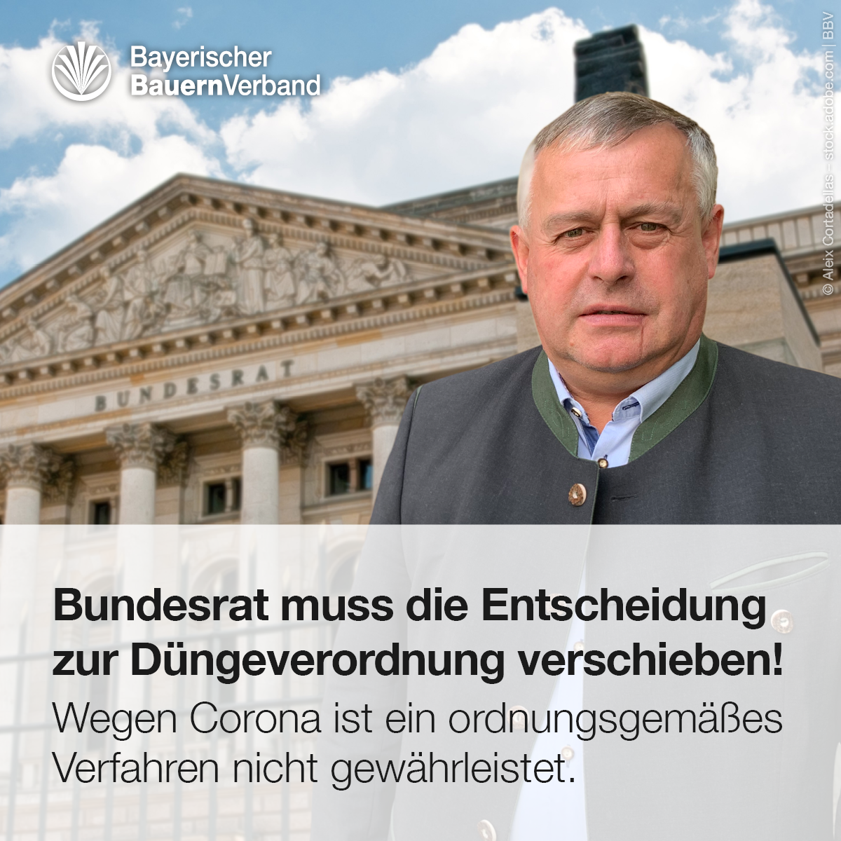 Im Zusammenhang mit der Düngeverordnung sei das Prozedere ohne hin völlig überhastet. Die öffentliche Anhörung, bei der sich jeder Landwirt beteiligen kann, läuft bis zum 2. April. Laut aktueller Planung soll der Bundesrat dann bereits am 3. April über die geplante Verschärfung der Düngeverordnung entscheiden. „Das kann und darf doch nicht sein!“, kritisierte Bauernpräsident Walter Heidl am 18. März im Interview mit der Augsburger Allgemeinen.